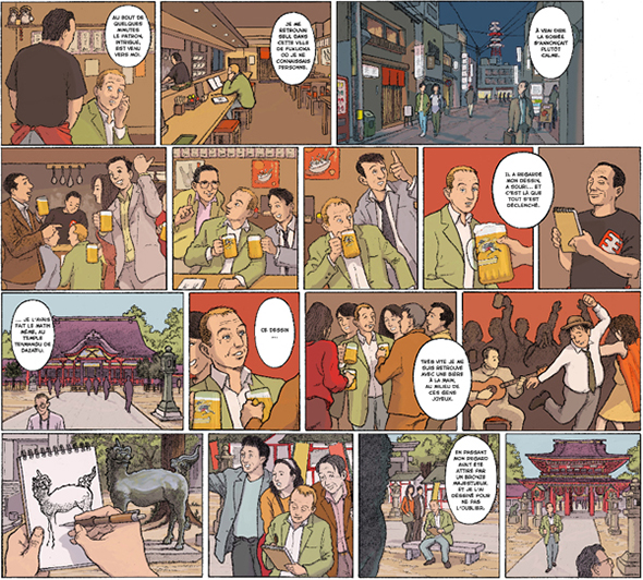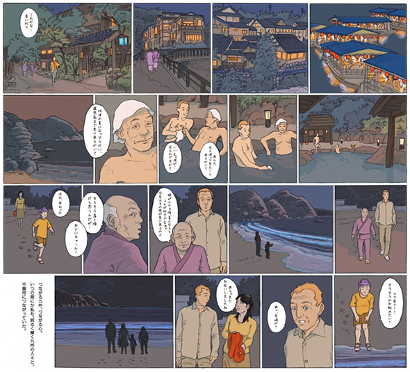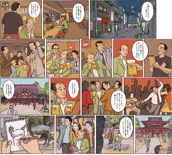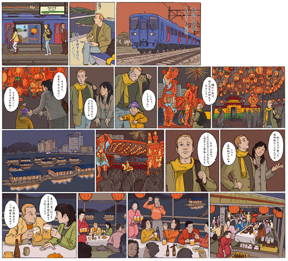 Histoire parue le 14 décembre 2012 dans le quotidien Maïnichi pour commémorer les 140 ans du journal, mettant en scène les lieux touristiques les plus pittoresques du Kyûshû. Attention: lecture de droite à gauche.